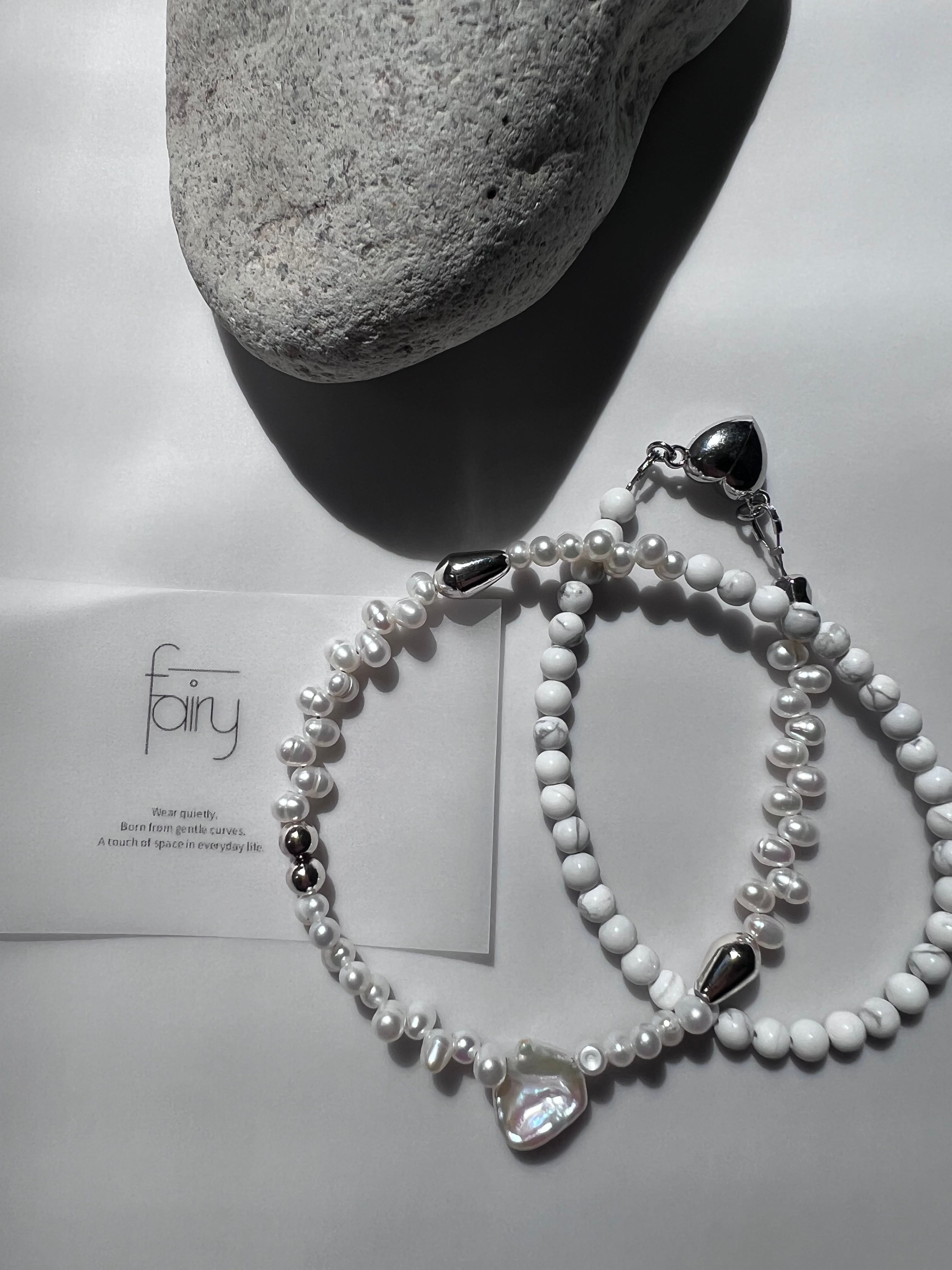 淡水バロックパールと、やわらかな白が美しいハウライトを組み合わせたネックレス。