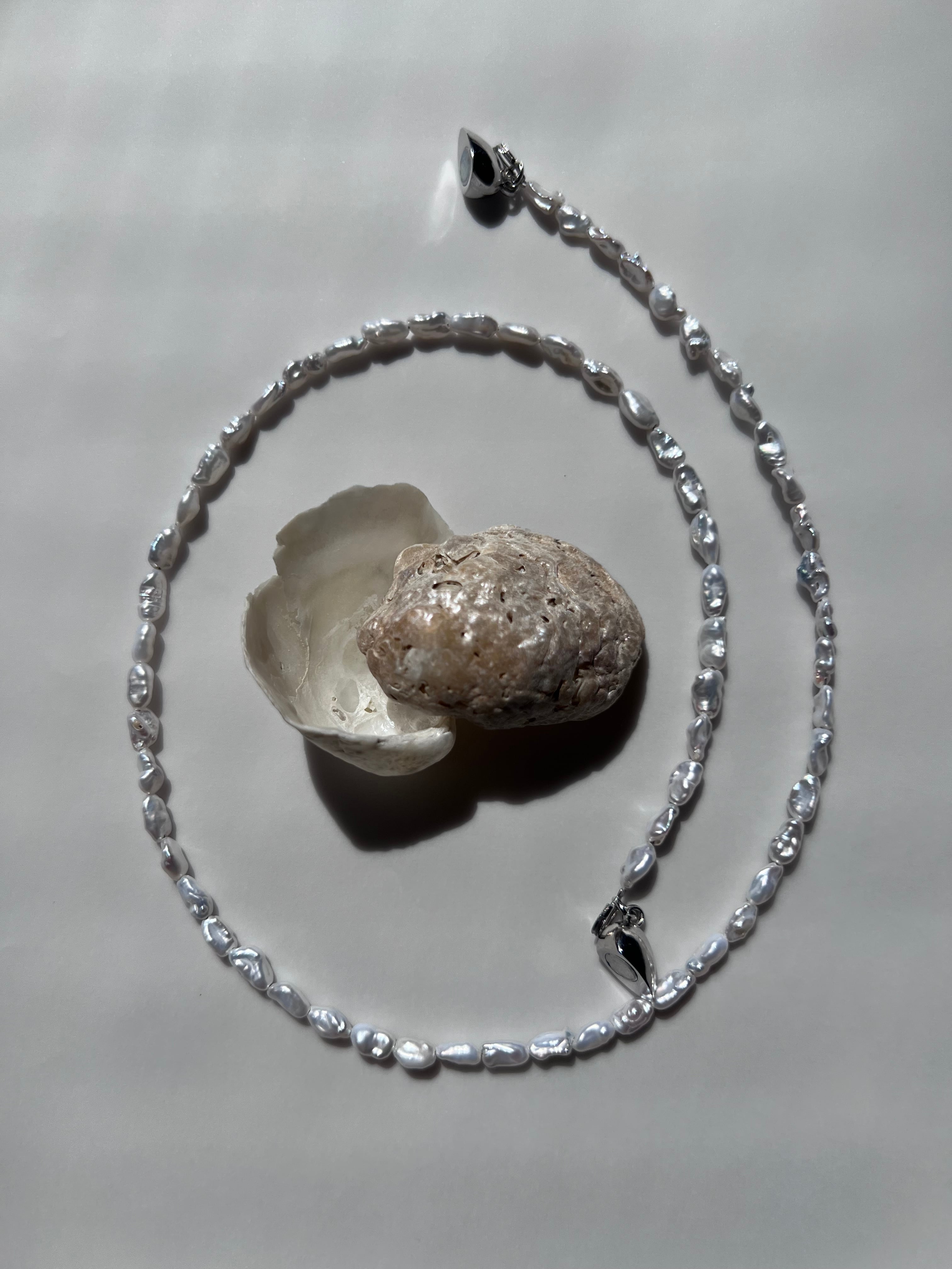 小粒でやわらかな輝きが魅力の淡水パール(ライスパール)を使用したネックレス。