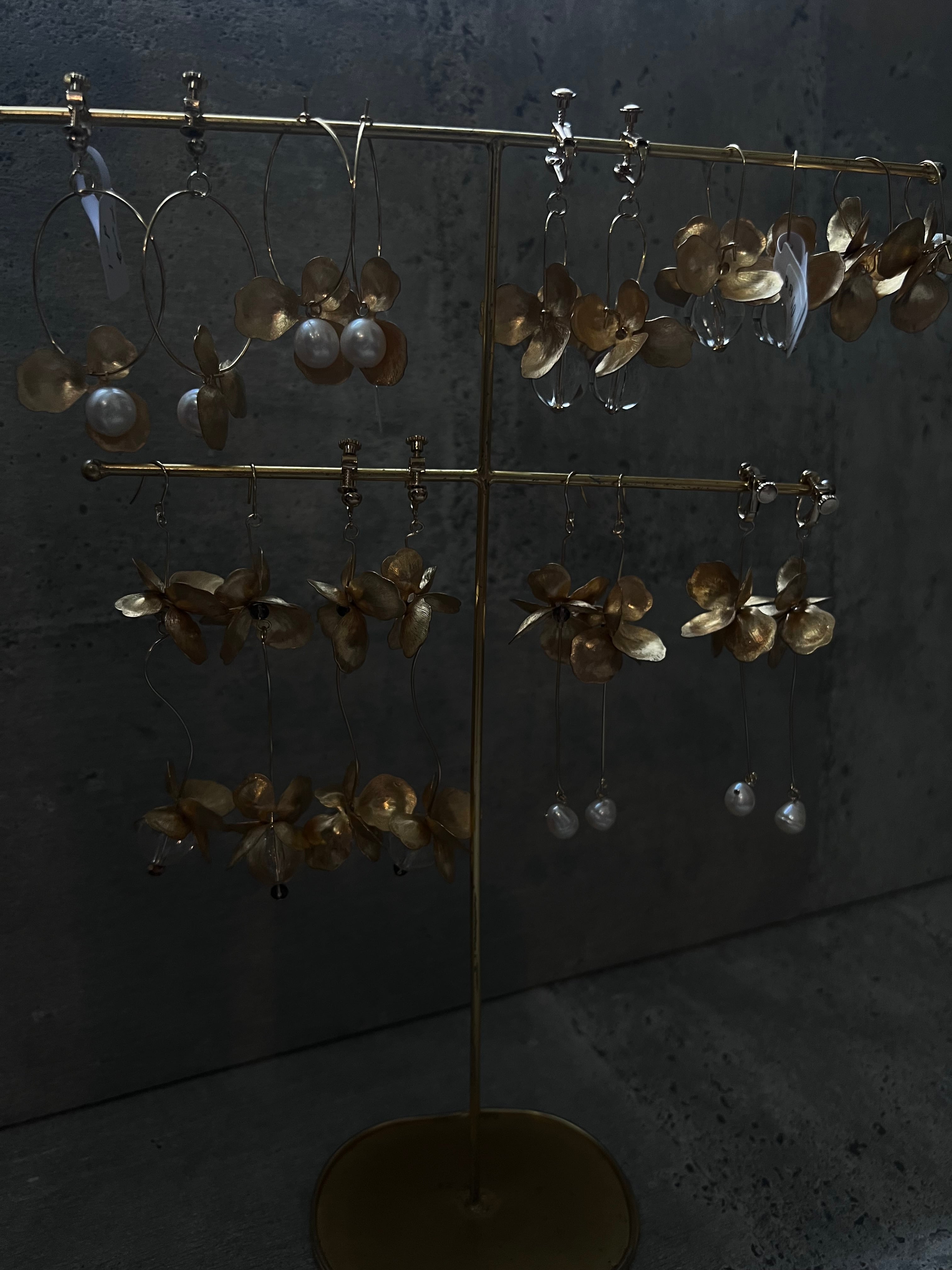 華やかな真鍮製の花と可愛らしいコットンパールが調和した、Brass Flower Cotton Pearlピアス/イヤリング。